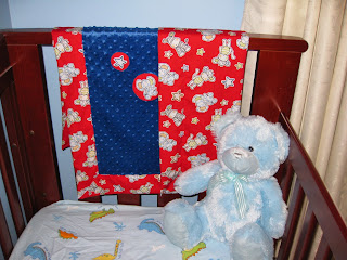 I really love the rich colours and cute characters in this baby boy's blanket.